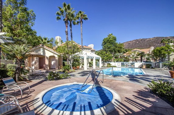 Residents enjoy a resort-style heated pool and a spa for relaxation. Ample guest parking spaces are available. The surrounding area features hiking trails and scenic landscapes, making it ideal for outdoor enthusiasts. The close proximity to Lake Poway enhances outdoor activities and enjoyment.