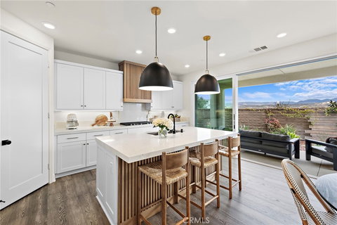 Luxury Living Awaits in This Exquisite 55+ Home with Stunning Views. Prepare to be amazed by this exceptional luxury home located in the coveted 55+ community of Gavilan in Rancho Mission Viejo. Located at the end of a peaceful cul-de-sac and boasting panoramic views of the hills, city lights, and beyond, this single-level residence offers a blend of modern elegance and comfort, leaving no detail overlooked. Step through the front door to discover distressed gray oak luxury vinyl floors, 7" baseboards, custom magnetic blinds, and motorized screens. The spacious living room is anchored by a large picture window, showcasing the breathtaking views. A vaulted ceiling with recessed lighting creates an airy atmosphere. Matching fluted wood on the island and stove hood makes for stunning view as you enter the main living space. The chef’s kitchen is a true highlight, featuring white marble-look quartz countertops, a walk-in pantry with a custom door, stainless steel appliances, and two pendant lights over the island. The highly desirable 3-panel stacking door effortlessly merges the indoor and outdoor living spaces, leading to a private backyard oasis. The expansive yard includes a lush garden with a trickling fountain, a linear wood panel focal wall, and bistro lights strung overhead for the perfect dining atmosphere. Enjoy panoramic views, two motorized sun shades, and fruit trees in the large side yard complete with garden beds. Down the hallway, the guest room is generously appointed with plush carpet, a ceiling fan, and an en-suite full bath featuring a step-in shower, tile surround, and quartz countertops. A customized office/den with glass sliding doors provides an ideal, soundproof space for work or relaxation. The hallway also offers a powder bath, laundry room, and a linen cabinet for added convenience. On the opposite side of the home, the primary suite offers a sanctuary with stunning hillside views, plush carpet, custom blinds, and a ceiling fan. The spa-like master bath features quartz counters, a marble-look tub and shower surround, a framed mirror, and a spacious walk-in closet. Residents of this exceptional home enjoy direct access to The Hilltop Club, featuring a resort-style pool, jacuzzi, gym, bar with cocktail tastings, and view-side firepits. Additional privileges include full access to RMV Resort amenities and exclusive 55+ community features. This rare gem of a property combines privacy, luxury, and modern convenience—truly a must-see!