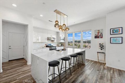 Welcome to this Stunning Townhome with Million-Dollar Ocean Views in the highly sought-after Verandas Neighborhood in Esencia . Experience unparalleled luxury with panoramic ocean views from the backyard, great room, master bedroom and bathroom, and secondary room. This exquisite home features premium upgrades including waterproof LVP flooring, upgraded white lacquer cabinetry, and stylish woven shades throughout. The chef’s kitchen is a culinary dream, boasting a striking white and gold backsplash, marble-look quartz countertops with a waterfall edge, a stunning 7-light gold and glass pendant chandelier, modern white cabinetry, and gold accents. Custom geometric focal walls at the entry and rear hall enhance the sophisticated ambiance. Step through the double French doors to a rare townhome backyard offering breathtaking views, a paver patio, pet-friendly turf, and a drop fence designed to maximize sunset views. Inside, the spacious great room features recessed lighting and a chic designer chandelier. Upstairs, the bedroom level includes built-in white lacquer cabinetry in the hallway for extra storage, along with a laundry room equipped with upper cabinets and an included washer and dryer. The thoughtfully designed layout places the bedrooms on opposite sides for optimal privacy. The primary suite is a retreat with stunning views, upgraded wallpaper accent wall, and a modern ceiling fan. The ensuite bathroom includes white e-stone countertops, a large soaking tub, a frameless glass shower, and contemporary light fixtures. The two secondary bedrooms are generously sized and share a hall bath with dual sinks, upgraded lighting, and a separate toilet/shower area. The attached two-car garage provides convenient backyard access. This home is ideally located in Rancho Mission Viejo, just a short walk to Hilltop Club’s amenities—pool, arcade, workout facility, jacuzzi, and cocktail bar—as well as North Plunge’s pool, sprinkler pad, tennis, pickleball, and sports fields. Enjoy resort-style living just minutes from the beach and the Spectrum, and a short bike ride on San Juan Creek Trail to Dana Point.