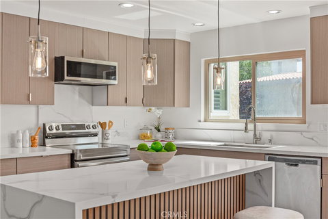 The home features a brand-new chef’s kitchen with high-end cabinets, quartz countertops, a waterfall island, pendant lighting, recessed lights, and new stainless-steel appliances. Hardwood flooring runs throughout the home, complemented by elegant light fixtures, chandeliers, newer windows, and sliding doors. The main floor boasts a spacious layout with a kitchen that opens to a bright living room, a large dining area, and an additional living room or den featuring a handmade tile fireplace, which can easily be converted into a fourth bedroom.