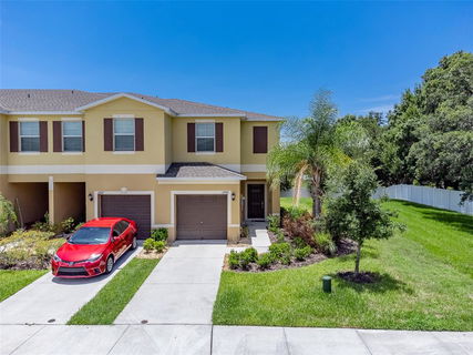 Back on market due to buyers financing. Location, Location Location! The famous words of Real Estate. This end unit townhome has no backyard neighbors or neighbors on the right side. Extra parking right outside the front door. No CDD Fee's and Low HOA fee's. 2 Bedrooms, 2.5 bathrooms, loft and 1 car garage. As you enter the foyer you will notice the downstairs open floor plan that is so comfortable and inviting to accommodate all. The open concept living room and a dining room floor plan flows seamlessly to the kitchen with 36" stagard wood cabinets with crown molding and modern black appliances for entertaining family and friends. Located behind the dining room are sliding glass doors out to the screened lanai with a ceiling fan and views of the pond. Also you'll get to enjoy peaceful mornings or relaxing evenings on your back screened patio with a very tranquil setting. Tucked away downstairs is a half bathroom with pedestal sink. As you head upstairs there are 2 beds and 2 full bathrooms as well as a flex/loft area to serve as you see fit. The master has a large walk in closet, ensuite bathroom with dual vanity sinks and a walk in shower. The second bedroom also has a walk in closet. The secondary bathroom features a tub/shower combo. The washer and dryer in laundry room are included in sale. The 1 car garage is perfect and extra storage. A Puronics® whole-house water treatment systems that utilizes green technology to produce great tasting, crystal clear water while reducing scale caused by hard water. This townhome is turn key, ready. The Community of Summerfield offers an array of Amenities & Social Events Including 2 pools, Parks, Tennis, Ball Fields, Elementary School, Charter School, Indoor Full-Size Basketball Court, and Fitness Center. Additional community benefits include a beautiful golf course. Quick access to I-75, Tampa, St. Joseph’s Hospital, Amazon Distribution Center, and MacDill AFB., VA Clinic in community.