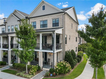 WILL GO FAST! ELEVATOR TO ALL LEVELS! Sought-after most popular Charleston floor plan in SOLD OUT AND GATED Harlow neighborhood, near to Downtown Alpharetta, Avalon, Downtown Roswell and The North Point District. Four sides brick upgrade to this end townhome with best lot in the neighborhood and upgraded mature landscape package. This home has the highest elevation, overlooking the open central green spaces and near to the pool & clubhouse (Harlow Hall). Two oversized front covered porches give amazing charm to the elevation on this end unit home, giving you more privacy as well as great indoor-outdoor living and dining flow to all spaces. Overlooking the beautiful Harlow Green in front and no neighbor front facing you behind at your private rear entry garage as well as your porches are detached from neighbors and there is a third back porch off breakfast room/keeping room with gas line for grilling. 3 large bedrooms plus an additional amazing large lower main level room with designer wet bar and large private covered patio- perfect for guests, office or home theater. Every upgrade imaginable done ($120k+) including elevator, surround sonos throughout, designer wall paneling and solid wood beams, upgraded wide plank light wash hardwood flooring throughout, gas line to back patio, artisan custom closets throughout home and pantry, solid core interior doors, mud bench and landing zone, Phoenix technology package, and designer window treatments. Gourmet chef's kitchen with oversized center island with quartz countertops, 42" cabinets, farm sink, side island bookcases, soft close doors, 36" gas cooktop and upgraded appliance package as well as upgraded built-in large side butler pantry at dining and walk-in pantry. The kitchen has amazing natural light opening to both dining, keeping room and back grilling porch as well as large fireside living room with upgraded Waves Fireplace, opening by double doors to enormous private covered patio. Upgraded side office built in space on main level in keeping room makes the perfect small office space or homework room. Large owner suite with natural light-filled bathroom featuring upgraded shower rain heads and custom tilework, shower bench, as well as large walk-in closet with custom built-in shelving and cabinetry. True quality and craftsmanship to this thoughtfully designed home. Impressive amenities include the Harlow Hall clubhouse, 2 pools, tennis courts, green spaces, private dog park, and walking trails as well as many neighborhood events such as pickleball tournaments, music on the green, golf outings and wine tastings. Welcome Home!