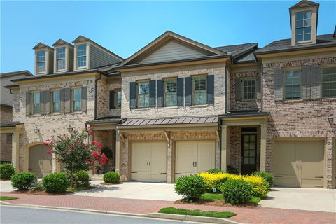 Southern Living Elegance in Historic Roswell with Serene Treetop Views. Exquisite, light-filled townhome in the vibrant, walkable community of Goulding. Outstanding location just steps to the fun of Canton Street. Beautifully appointed with main level foyer, coveted kitchen level garage entry and elevator to all three gorgeous levels. Enjoy entertaining around the expansive quartz kitchen island. Custom cabinets to ceiling, quartz backsplash, walk-in pantry and keeping room area. Wonderful flow to dining area and inviting family room with gas fireplace, built-in cabinetry, and opening glass Nano door to deck and covered porch. The perfect spot for the incredible sunset views. The upper level is equally engaging with a gracious main suite and sitting room, Juliet balcony with retractable screens, luxurious spa bath and walk-in closet. Two en-suites complete the upper level with one bedroom featuring built-in bookshelves and office closet system. Spectacular terrace level is perfect for game day with media space, modern electric fireplace, serving bar, additional guest suite, and private paver patio. The pinnacle of "Urban-Suburban" living. (NOTE: This home is the same model as the most recent sale in the neighborhood at 325 Windy Pines Trail despite difference in square footage reflected)