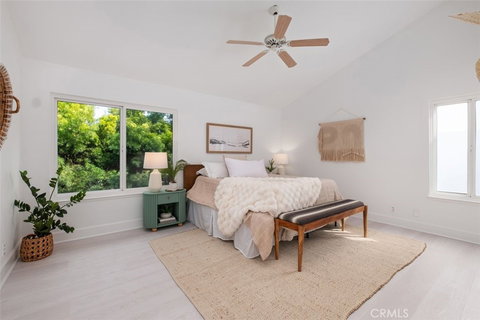 Beach-Close Bliss! Nestled in a prime end-of-cul-de-sac location, this 3-bed, 2.25-bath end unit gem offers the perfect blend of privacy and coastal charm! From the moment you step through the oversized double front doors onto timeless terracotta pavers, you’ll feel the warmth of natural light dancing off freshly painted white walls, creating an open and airy vibe. Main floor living? You got it! A spacious bedroom with a private entrance and remodeled bath makes hosting guests or multi-generational living a breeze. The expansive cathedral-ceiling living room flows effortlessly into the dining area, where beautifully cased windows frame the space over looking your backyard patio that runs the length of the home. This private oasis, surrounded by mature trees and soft evening lighting, is your ultimate retreat—complete with gated access for both seclusion and convenience. Back inside, the updated kitchen offers abundant storage, sleek stainless steel appliances, and direct access to a second outdoor patio space —ideal for everything from bbqing to dining al fresco to nurturing a raised garden in the beautiful California sunshine. Ascend your floating stairs onto brand-new luxury vinyl floors into a dreamy peek-a-boo ocean view primary suite with soaring ceilings, windows showcasing serene backyard views and a large walk-in closet. The en-suite bath features an upgraded shower/tub combo and a spacious vanity. A third bedroom, extra storage, and a ¼ bath complete the second level. Additional perks? A/C for those rare extra-warm days, recessed lighting, ceiling fans, a water softener, a water filtration system, an oversized 2-car garage with washer and dryer & tons of storage and workspace. The resort-style community pool and spa and park like grounds with lush greenery and winding paths to private play area are just the cherry on top! Close to world-famous beaches, award-winning schools, top-tier dining, and incredible shopping, this is the ultimate in casual coastal lifestyle. Love where you live - this is the one!