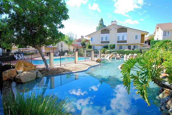 Residents enjoy shared amenities like a pool, clubhouse, and spa. Well-maintained landscaping and water features enhance the community experience. Assigned parking spaces and attached garages provide convenient access to the units. The neighborhood features a courtyard view and a quiet atmosphere.