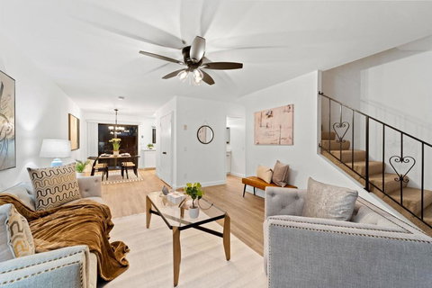 Newly remodeled townhome in the Gold Creek complex of Mira Mesa. An extensive renovation was just completed featuring an updated kitchen, bathrooms, luxury vinyl plank flooring, fixtures, and more. It has a nice layout including an open living room with a fireplace and spacious bedrooms. Plenty of outdoor space included with a private patio as well as 2 balconies upstairs. In-unit washer/dryer is included. Located near shopping, restaurants, easy access to highway 15, and great schools.