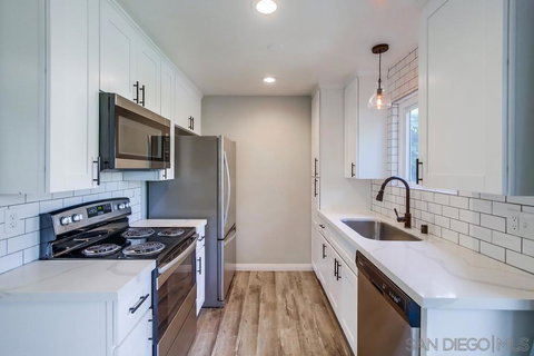 SELLER OFFERING $8K CREDIT TOWARDS BUYERS CLOSING COSTS OR RATE BUY DOWN! Welcome to your beautiful new home in Mira Mesa!! Remodeled 1st floor condo w/ views of the sparkling swimming pool. 2 bedrooms/1 bath, white kitchen cabinets, quartz counter-tops, S.S. appliances, pantry cabinet, & a private patio off the side of the kitchen. Upgrades include: wood laminate floors, dual pane windows, canned lighting throughout, mirror closets, & a designer bath w/ exposed beam & black/white tile floors. Assigned carport parking /extra avail. Plenty of off street parking. Close to shops & parks. HOA allows installation of in unit W/D hookups. Owners need to file an Architectural Variance Request with the Board, and the HOA plumber must do the plumbing installation inside the wall.