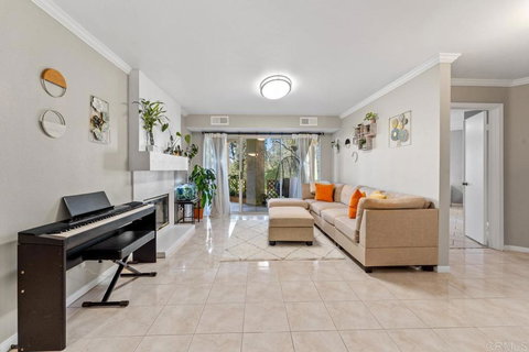 Located in the highly sought-after Affinity Complex in Scripps Ranch, this home boasts three separate access points to the backyard. Upon entering, the front door opens to a spacious living room featuring a cozy fireplace and flush mount lights, with a large slider leading to a patio area offering wonderful views. The large primary bedroom showcases a gorgeous city view, a spacious closet, and wide plank tile flooring, accompanied by a private en-suite bathroom. The master bathroom is equipped with a vanity boasting dual sinks, a newly resurfaced shower tub, and a linen closet. A full laundry closet, complete with washer, dryer, and linen storage, adds to the home's convenience. Relish in stunning Western sunsets from your back patio, and take advantage of the adjacent HOA-maintained space. Parking is hassle-free with a detached 2-car tandem garage and ample guest parking available. Residents can also enjoy the amenities of the Affinity complex, including two pools and spa. Conveniently located close to shops, restaurants, and Lake Miramar, this home is zoned for fantastic schools. With easy access to Interstate 15, parks, and more, this property offers the ideal Southern California lifestyle. Don't miss out on this opportunity!