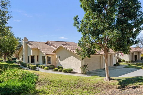 Rare 3BR/2BA condo with gorgeous views and private. 3rd BR is currently used as office but has a closet. Kitchen has stainless appliances that are 9 years old - dishwasher, stove, refrigerator, & microwave. Newer granite counters & stainless sinks including large window above sinks & recessed lights. Dining area in kitchen with new chandelier plus custom built small cupboard in dining area. Newer tile floor & blinds; glass sliding door to patio. Livingroom & formal dining room - high ceilings, newer wood flooring & window covers; fireplace. Mstr bedroom & bath: newer wood flooring & window coverings & light above large mirror in vanity area. Walk-in closet; shower has newer glass shower doors and toilet. Extra storage in lab. 2nd Bedrm: newer wood flooring, lighting & window coverings. Guest bathroom has newer countertop & glass sliding doors on tub. 3rdBR/Office: - newer wood flooring & closet. Hallway: Linen clost. Laundry rm: newer washer& dryer. 2 car garage,newer gar. door,storage cabinets,workbench. Patio: newer aluma-wood patio overhang. This condo has been remodeled and is the largest in the Villas plus gorgeous views. Active Oaks North Community Center 5 minutes away with pool, jacuzzi, sauna, fitness rm, library, arts & crafts rm, lawn bowling green, pickleball & tennis courts. Popular Travel Club, Tennis, Pickleball & Dance Clubs. Bernardo Winery is 5 minutes away with Farmers Market every Friday morning; wine-tasting restaurant & others shops. Oaks North Golf Course is across from the Community Center. Equipment: Garage Door Opener Sewer: Sewer Connected Topography: LL