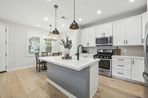 Welcome to this beautifully upgraded 4-bedroom, 3-bath end-unit in the desirable Garretson Townhomes of Del Sur. This highly sought-after floor plan offers a full bedroom and bathroom on the first floor, perfect for guests or multigenerational living. The extended front patio wraps around the home, creating an inviting space for entertaining. Enjoy picturesque views from both the front and back of the home, ideally positioned between two neighborhood parks...