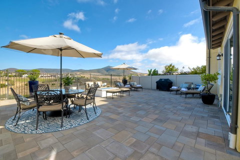 Absolutely stunning! This gorgeous view property is located in Del Sur's gated Veridian community. It is move-in ready and shows like a model home. Southeasterly canyon and mountain views with wonderful sunlight throughout the day. Highly upgraded with custom built-ins, provenza wood flooring, upgraded carpeting, crown molding, and shutters throughout. The delightful kitchen has Quartz countertops with a full custom tile backsplash, stainless steel appliances, a white porcelain kitchen sink, seeded glass cabinets, a five burner gas cooktop and a large island with bar seating. Professionally designed backyard with elegant hardscape and landscape. Walking distance to Poway Unified Schools! The entertainer's backyard has lovely sitting areas, a built-in firepit, planter areas with bench walls and an enchanting fountain. The large sideyard has synthetic grass and a gated dog run. The downstairs has a guest bedroom with a full bathroom and a walk-in shower. The upstairs loft area is perfect as an additional living area and has potential for a 5th bedroom or office. You'll enjoy views from the master bedroom and the master bathroom feels like a true getaway with a soaking tub, separate shower and dual vanity sinks. Additional highlights include all upgraded secondary bathrooms, vaulted ceilings, and built-in cabinetry. This is a highly sought after community with wonderful parks, Splash Park, hiking trails, Boys and Girls club, restaurants, shopping, and the award winning Poway Unified Schools! Walking distance to Del Norte High, Design 39 K-8 and Stone Ranch Elementary. Resort style community pool and spa. This is a premium property and a must see! Equipment: Range/Oven Sewer: Sewer Connected Topography: LL