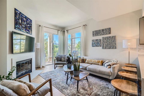Serene, Top floor, corner unit with tons of light in the sought after and amazing central Mission Valley location at the River Colony complex. Walking distance to amazing shops, restaurants and the trolley! Sit and relax with morning coffee or an evening cocktail on the private balcony above the lush view of the San Diego River. Enjoy the coziness of the wood burning fireplace and the modern stylish kitchen and dining area. You will love and appreciate the warm solid inviting wood floors. See Supplemental remarks below. Baths are modern, bedrooms are large, spacious and bright. Architecturally interesting and pleasing with 9' ceilings and angled walls. Plenty of storage in the unit plus stacked laundry in closet. You will love the dual side by side parking spaces in gated garage right by the elevator! You will enjoy the resort style pool, spa and gym centrally located. One of a kind unit that you will love to make your home.
