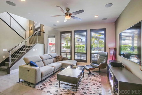 Experience luxury living at this stunning 3 bed/2.5 bath townhome that sits on a premium large lot with views and features worth $150K+ in upgrades. Enjoy an oversized private patio with a built-in fire pit, BBQ island perfect for entertaining, and lush foliage. The open floor plan with high vaulted ceilings offers natural light, quartz countertops, tile floors, and a gourmet island kitchen. The master suite includes dual vanities, a spa-like bathroom with marble stone, and custom shutters. Civita offers the best resort clubhouse amenities in San Diego with pools, parks, trails, a dog park, new STEAM elementary school, and retail shopping, all with lower HOA fees. This hip and modern townhome perfectly blends luxury, privacy, and community. Don't miss your chance to own this exceptional property in the sought-after Frame & Focus community. Schedule a viewing today! This exceptional townhome sits on a premium lot with views and an oversized private patio, featuring lush landscaping, a built-in gas fire pit, and a BBQ island with a refrigerator, perfect for entertaining. The gourmet island kitchen features high-end stainless steel appliances and a reverse osmosis water filtration system, while the home is equipped with a full-size stackable washer and dryer, custom shutters, energy-efficient ceiling fans, stylish accent lighting, and a pre-wired surround sound system. The garage offers ample storage space with custom cabinets, storage racks, a water softener/conditioner, and a 240-volt electrical outlet for charging electric vehicles or powering tools. The outdoor space is pre-wired for a television or display, creating the perfect environment for hosting unforgettable gatherings and events with family and friends. As a resident of Civita, you'll have access to an array of outstanding amenities, including resort-style pools/spas, cabanas, BBQs, fire pits, a two-story gym open 24/7, private clubhouse room rentals with kitchen and fire pits, parks, trails, a dog park, an outdoor movie space for summer concerts and movie nights, Civita Shuttle Service to and from Hazard Center trolley station and Fenton Marketplace, as well as on-site security and concierge.