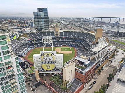 Rarely available townhome at The Legend—lives like a single-family home with four private patios and panoramic views straight into Petco Park and the concert stage. Fully renovated in 2022, this luxury corner residence features a designer kitchen, open living areas, guest bath, two ensuite bedrooms, and a loft leading to the rooftop patio. Includes two parking spaces, motorcycle spot, and private storage, with option to be sold fully furnished. Enjoy 24-hour security, concierge, gym, sauna, pool, BBQ areas, and the iconic 7th-floor deck overlooking Petco Park.