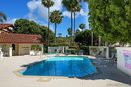 Residents enjoy various amenities, including a swimming pool and jacuzzi. Sidewalks lead to community grounds adorned with mature palm trees. The location allows quick access to shopping centers, freeways, and the nearby trolley for easy commutes.