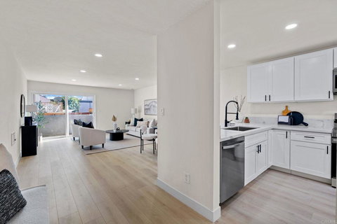 This beautifully remodeled 3 bedroom, 2 bath first floor condo has been completely renovated and is now move-in ready. It features brand-new countertops, cabinetry (including a HUGE pantry), modern appliances, and an oversized coat closet in the hall with extra linen storage. You'll love the recessed lighting, dual-pane windows, new LVP flooring, and fresh baseboards throughout. The primary suite boasts two closets, along with new vanities, showers, fixtures, and plumbing in the bathrooms. This home is truly dialed in and stunning, with a spacious back patio area ready for your personal touch. Located in a gated community with secure parking and extra storage. This condo is an excellent opportunity whether you're a first-time buyer, seeking an investment, or considering downsizing. Ideally located near one of the two pools in the complex. The location couldn't be more convenient, with shopping, dining, essential services, and stunning beaches just minutes away. Plus, commuting is a breeze with easy access to freeways 5, 163, 805, 8, 52, and 15.
