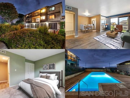 Turnkey single-story condo - no stairs to climb - located at the end of a cul-de-sac in the very private gated hilltop community of Villa Fontaine in the beautiful Del Cerro neighborhood. This recently upgraded condo features plank wood flooring, stainless steel kitchen appliances, golf course and mountain views from the kitchen window and balcony, stacked washer/dryer, new carpet in the bedrooms, a large master suite with a walk-in closet, and an en suite covered and enclosed porch/patio space, the 2nd balcony is located off the living space and has some amazing golf course, mountain and sunset views. Since this community is perched high up in the Del Cerro hills you get amazing views along with the amazing San Diego coastal breezes. Literally, no stairs to climb from your assigned parking space to your front door with another added bonus of an assigned 1 car garage for extra storage and parking. The quaint community of Villa Fontaine has less than 40 units total and is not only a gated community with a very private feel, but also has a gorgeous pool/spa area with mountain views, plus some great neighborhood walkability and ample street parking at the entrance of the community for when guests visit. Complex Features: ,, Equipment: Dryer, Washer Sewer: Sewer Connected Topography: ,,SSLP Frontage: Golf Course, Open Space