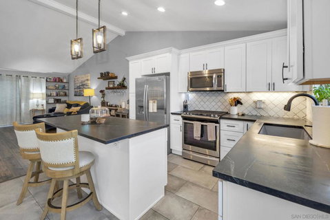 Nicely upgraded end-unit townhome with attached 2-car garage in the highly coveted Pacific Bluffs Complex in Clairemont! This modern, split-level home boasts 14 ft vaulted ceilings with a spacious, open floor plan. Not only are there hardwood floors throughout but the beautifully appointed finishes include: Soapstone countertops in the kitchen, custom tile-work and Carrera marble in the baths and a designer paint scheme. If that wasn't enough, there's also a great den with a wood burning fireplace! There's also a very large, enclosed private patio perfect for summer BBQs! The unit is situated in a well maintained, park-like complex that features 2 swimming pools (1 adult and 1 for small kids), bbq area and clubhouse. To top it all off, the low HOA fee covers just about everything including Cable TV and high-speed internet which is unheard of! Truly a gem of a property!