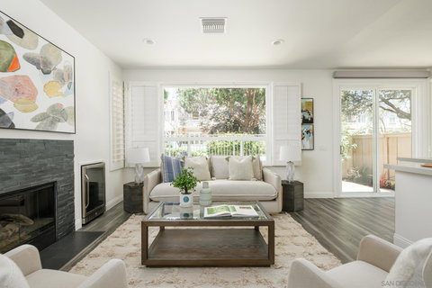 Lovely townhome in a great location on the greenbelt in the desirable Andria community. Premium remodel work done in 2018. New kitchen features cabinets with shaker-style, soft-close doors; Caesarstone quartz countertop and backsplash, Blanco Silgranit sink, mobile island and stainless steel appliances. New A/C condenser with complete replacement of HVAC ducting and vents. New flooring, LED lighting and energy efficient windows installed throughout the home. The primary bedroom is perched above the Renaissance greenbelt with beautiful views, vaulted ceilings and an upgraded fireplace equipped with fire glass. The remodeled primary bathroom features a new light filled walk-in shower with Hansgrohe rainfall showerhead and premium low-e glass enclosure, new double vanity, quartz countertop, Kohler sinks and framed, in-wall medicine cabinets. Fully customizable Elfa system in the primary closet, large California Closet reach-in units in the second bedroom and spacious walk-in closet in third bedroom. Nice loft/office/flex space added upstairs. Laundry room features energy efficient washer and dryer on pedestals. New sliding glass door with custom, remote-controlled roller shade leads out to the bucolic rear yard with views to the greenbelt and a beautiful fountain with pond. Bright 2-car garage with epoxy flooring and overhead storage. Walk to shopping and restaurants at Renaissance or the huge newly renovated UTC mall. Complex is located close to UCSD, Scripps Hospital, La Jolla, and the new trolley line. Ride to Mission Valley, SDSU or head downtown to take in a Padre game! Complex Features: , Equipment: Dryer,Garage Door Opener, Range/Oven, Washer Sewer: Sewer Connected Topography: LL,GSL