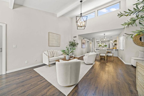 Stunning 2 bed, 2 bath end-unit home with sophisticated designer finishes throughout. Features luxury vinyl plank floor, chef’s kitchen with custom cabinets, marble backsplash, quartz countertops, & stainless steel appliances. Open-concept layout with high ceilings and living room fireplace. Spacious primary suite with custom closets, vanity area, luxury wallpaper & en-suite remodeled bathroom. Balcony access from primary bedroom & living room. Remodeled hall bath & second bedroom with mountain views. Includes in-unit washer/dryer, newer AC, tankless water heater, custom blinds, designer light fixtures, & 1 assigned parking space directly in front of unit plus 1-car garage. Community amenities include 2 pools, tennis courts, & clubhouse. Centrally located near schools, shopping, restaurants, parks, & freeways. VA & FHA APPROVED! HOA includes water, sewer & trash!