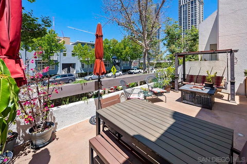 True pride of ownership shows with this light, bright & wonderfully upgraded ground-level residence at Park Row. Enjoy the beautiful San Diego weather on the approx. 400 sq.ft. patio, perfect for ‘al-fresco’ dining, gatherings or just relaxing! Come fall in love with the open floorplan, TWO patios, elegant crown molding throughout, ambient fireplace with tile surround and mantle, and a thoughtfully remodeled kitchen featuring quartz surfaces, recessed lighting, tile backsplash, stainless appliances, and custom executive desk. The primary bedroom is complete with organized walk-in closet, access to the second patio, and a remodeled bathroom with a frameless shower. The spacious second bedroom also offers an organized closet while the guest bathroom has been nicely updated. Outstanding location near the pool and clubhouse; this is true urban living in the heart of the beloved Marina District-- all for a low HOA fee and don’t forget the guest parking which is rare for downtown. Park Row is perfect for those who do not seek high-rise living but wish to enjoy the urban lifestyle! Adjacent to Pantoja Park for family picnics and dog walking, you will delight in easy walkability to many of San Diego's best restaurants and extensive shopping (The Headquarters, Seaport Village, the Gaslamp Quarter & Little Italy among others). Nearby is Civic Center with Broadway Musicals, the San Diego Symphony, and recently opened The Rady Shell for waterfront symphonies, and many other cultural attractions that downtown San Diego offers. The charming Park Row community features beautifully landscaped grounds planted with seasonal flowers to attract butterflies & hummingbirds, multiple water fountains, a clubhouse, pool, and spa. The HOA may also rent additional parking spaces, motorcycle parking spaces, storage, and bike storage (if available). Complex Features: ,,, Equipment: Dryer, Range/Oven, Washer Sewer: Sewer Connected Topography: LL