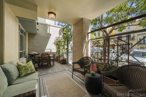 This gorgeous ground-level 2 bedroom, 2 bath residence at Discovery offers the perfect balance of being close to the action, yet removed from the noise and hustle-bustle. Beautifully maintained and truly move-in ready, it stands apart with a private street entrance on 9th Avenue with an oversized enclosed terrace, ideal for relaxing, entertaining, or letting furry companions enjoy the outdoors. Located in Cortez Hill, one of Downtown San Diego’s most charming and peaceful neighborhoods, you’ll enjoy a quieter, community-oriented setting while remaining close to everything the city has to offer. Inside, features include a warming fireplace, laminate wood flooring, fresh paint, and crown molding. The kitchen is equipped with upgraded KitchenAid stainless appliances, wine fridge, recessed lighting, ample cabinetry, kitchen organization station with open shelving, and an eat-at bar. The primary suite offers an organized walk-in closet and ensuite bath. Additional highlights include interior building access, a private storage space down the hall, and the convenience of street-level living. Discover why Discovery and Cortez Hill are among Downtown San Diego’s best-kept secrets. Discovery offers resort-style living in one of Downtown San Diego’s most charming and established neighborhoods, Cortez Hill! Residents enjoy secure underground parking, 24-hour concierge service, an elegant lobby, and thoughtfully designed shared spaces including the lush 2nd-floor Fern Grotto Garden and a stylish social lounge. The business center is equipped with commercial-grade office tools, and the 10th-floor rooftop deck features a heated lap pool, cabanas, spa, BBQ grills, and panoramic city views. A top-tier fitness center includes a sauna and steam room for full wellness access. Just steps away are local favorites like Tweet Street Park and with Little Italy and Balboa Park within walking distance. Plus, enjoy quick freeway access to I-5 and Hwy 163 from this peaceful urban retreat.