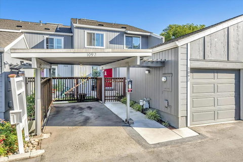 Beautiful gem nestled in a private cul du sac off Willow Street and offers easy access to the charming downtown Willow Glen, freeways and shopping. The perfect kitchen with granite slab, custom backsplash, gas stove, breakfast bar, pantry and inside laundry. The spacious dining area flows from the kitchen to the living room complete with a gas fireplace and easy access to the private outdoor brick patio and Trex decking that is ready for relaxing or entertaining. Upstairs is the large primary suite with vaulted ceilings, a walk in closet and a cozy balcony perfect for morning coffee or tea with views of the pool. A huge skylight in the center of the home ensures you always have lots of natural light throughout the home. Fresh paint, shutters and LED lighting throughout the home brings a crisp clean feel to the home. There is an attached garage, carport and a designated spot nearby. Its ready to move right in!