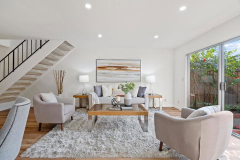 Beautifully updated townhome in the heart of Silicon Valley. The townhome is situated in a prime and quiet location in the sought-after Merrivale West community. The spacious living area feels like a single-family home, offering new laminate flooring, recessed lighting, and a half bath on the main floor. The kitchen features quartzite countertops, breakfast bar seating, and an abundance of new cabinetry and stainless-steel appliances. The home includes new carpeting upstairs, generous-sized bedrooms with expansive wall closets, and all-new interior paint throughout. In addition, the home features an attached 1 car garage with a new automatic garage door, an additional reserved parking spot, and private fenced yard with a patio. The community offers a pool, clubhouse, and plenty of guest parking. Proximity to several convenience stores and shopping.