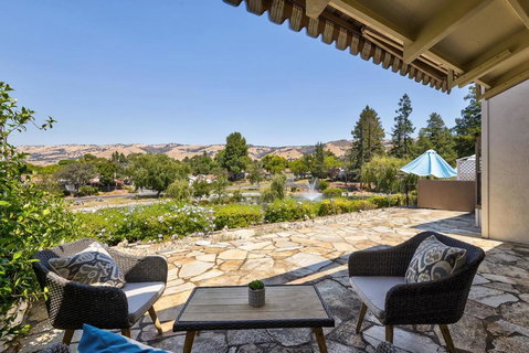 This single level condo with breathtaking views is located in The Villages Golf and Country Club, an active senior (55+) gated community. This home is in Montgomery Village and has 2 bedrooms and 2 baths, plus additional den/office. The 2nd bedroom includes a built-in Murphy bed for guests. The large great room overlooks a pond with the foothills of San Jose as a backdrop. Enjoy your morning coffee or an evening glass of wine on your private back patio while watching the fountain and ducks on the pond below. Nice private front courtyard patio as you enter the unit with plenty of space for an outdoor table and flower planters. Formal entry with open floorplan to dining/great room. HOA dues includes, 24 hr. security, golf membership, water, sewer, trash, basic cable, exterior maintenance. A variety of amenities are available to residents including , tennis, pickleball and bocce ball courts, 4 swimming pools and spas, gym, hiking trails, RV/boat parking, horse stables, & social clubs.