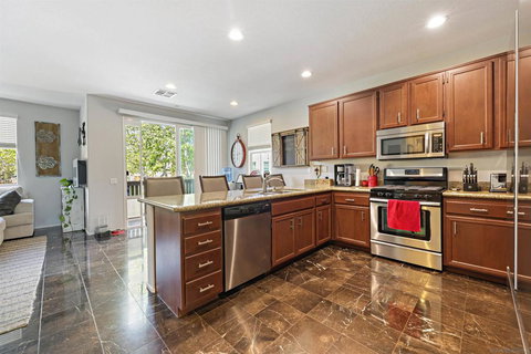 Welcome to your dream home in the coveted community of Riverwalk Santee! This meticulously maintained end-unit town-home boasts elegance, comfort, and modern convenience, offering a truly exceptional living experience.As you step inside, you'll be greeted by a spacious and inviting floor plan filled with natural light, creating a warm and welcoming ambiance throughout. The main level features a sleek and stylish kitchen with granite countertops, stainless steel appliances, and ample cabinet space, perfect for the home chef and entertaining guests.The adjoining dining area flows seamlessly into the bright and airy living room, creating an ideal space for gatherings and relaxation. The kitchen leads to a private patio, where you can enjoy morning coffee while soaking in the serene surroundings of the community. Upstairs, you'll find the luxurious master suite, offering a tranquil retreat with a generously sized bedroom, walk-in closet, and en-suite bathroom featuring dual sinks and a spa-like soaking tub.Three additional bedrooms provide plenty of space for family, guests, or a home office, each thoughtfully designed with comfort and functionality in mind.Other highlights of this exceptional town-home include tile floors throughout, recessed lighting, dual-pane windows, a convenient laundry room, and a two-car attached garage for added convenience and storage. Located in the highly desirable Riverwalk Santee community, residents enjoy resort-style amenities including a sparkling pool, spa, barbecue area, and playground, all surrounded by lush landscaping and scenic views. Welcome to your dream home in the coveted community of Riverwalk Santee! This meticulously maintained end-unit townhome boasts elegance, comfort, and modern convenience, offering a truly exceptional living experience. As you step inside, you'll be greeted by a spacious and inviting floor plan filled with natural light, creating a warm and welcoming ambiance throughout. The main level features a sleek and stylish kitchen with granite countertops, stainless steel appliances, and ample cabinet space, perfect for the home chef and entertaining guests. The adjoining dining area flows seamlessly into the bright and airy living room, creating an ideal space for gatherings and relaxation. The kitchen leads to a private patio, where you can enjoy morning coffee while soaking in the serene surroundings of the community. Upstairs, you'll find the luxurious master suite, offering a tranquil retreat with a generously sized bedroom, walk-in closet, and en-suite bathroom featuring dual sinks and a spa-like soaking tub. Three additional bedrooms provide plenty of space for family, guests, or a home office, each thoughtfully designed with comfort and functionality in mind. Other highlights of this exceptional townhome include tile floors throughout, recessed lighting, dual-pane windows, a convenient laundry room, and a two-car attached garage for added convenience and storage. Located in the highly desirable Riverwalk Santee community, residents enjoy resort-style amenities including a sparkling pool, spa, barbecue area, and playground, all surrounded by lush landscaping and scenic views. Conveniently situated near shopping, dining, parks, schools, and easy access to major freeways, this is truly a place you'll be proud to call home. Don't miss out on the opportunity to make this exquisite townhome yours! Schedule your private showing today and experience the epitome of Southern California living in Riverwalk Santee.