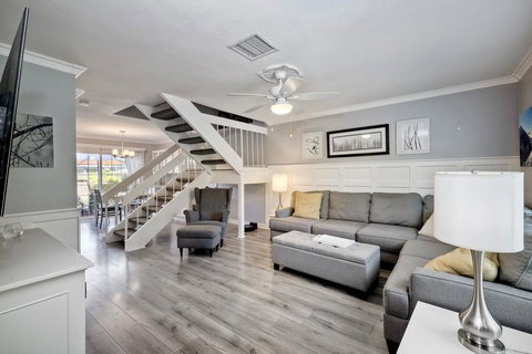 Beautifully updated - new wood floors, crown molding, paint, lights, counter tops, kitchen cabinets, stainless steel appliances, windows, paneling, ceiling fans, A/C, custom cabinets in dining room and glass backsplash, new vanities and lighting in bathrooms, Enjoy the beautiful patio and the detached one car garage. All bedrooms upstairs. Front door faces EAST. HOA amenities include pool, spa, and playground.