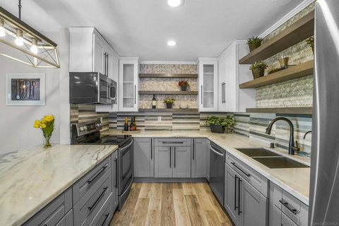 RARE CORNER-UNIT FLETCHER VILLAS TOWNHOME: 3BR/2BA MODEL w/ HUGE PATIO & 2 CAR GARAGE.” WHAT WE LOVE: *Single story, nobody above/below, share only one wall and other three sides are open and drenched with natural light. Perched up above the neighbors so you look out LR and see nothing but the mature canopy of landscaping and trees! *Oversized patio feat. custom privacy fence and pergola. Patio is north facing so get 6ft. privacy fence and shielding from direct sun. *Remodeled kitchen, two tone cabinets, curio, tile backsplash, floating shelves, stainless steel *Updated dual pane windows, wood flooring, master bath shower, fixtures & HVAC (WHAT WE LOVE, CONT.) Welcome to the vibrant community of Santee, where a community built on the shoulders of “always living your ideal lifestyle”, awaits. Nestled amidst the beauty of San Diego and only 30 minutes from Downtown, Santee embraces the outdoor enthusiast within you with the proximity to Santee Lakes, a serene haven for fishing, picnicking, and boating. For those craving adventure, the nearby Mission Trails Regional Park beckons with its stunning hiking/biking trails and breathtaking vistas. Santee effortlessly combines natural beauty with modern conveniences, as you'll find a host of shopping, dining, and entertainment options just minutes away. The location of Fletcher Villas is flawless: 3 turns and a few sips of coffee, and you’re on the 52 heading east or west, or, the 125 heading south. And, you don’t have to worry about crosstown traffic whizzing past your front door because its off street, so your only activity will be from your own neighbors. And, with the added convenience of a 2-car garage, this townhome/condo truly presents an excellent value that is sure to captivate your family & friends stopping by for a visit.