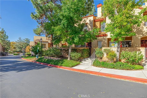 Welcome home to this charming 3-bedroom, 2.5-bathroom, 1,333 sq. ft. end-unit townhome nestled in the gated Seco Villas community of Mountain View Villas, tucked away in beautiful Santa Clarita. Step through the private front courtyard and enter into an inviting open floor plan with a great-room style main floor. The living room is flooded with natural light and features light colored wood-like flooring, a cozy fireplace, and a sliding glass door leading to the front courtyard—perfect for indoor-outdoor living. The adjacent dining area is highlighted by a moody, modern chandelier, adding a touch of elegance to the space. The modern kitchen boasts matching wood-like floors seen in the living room, ample storage, granite countertops, stainless steel appliances, and a convenient breakfast bar for casual dining. Additional main-floor features include a powder bath and direct access to the attached two-car garage with an in-unit laundry area. Upstairs, the home continues to impress design carpet on the stairs and the same wood-like flooring throughout the upstairs areas. Two spacious bedrooms with vaulted ceilings share a full hall bath, and one of the rooms is enhanced by a stylish custom board and batten accent wall. The primary suite offers vaulted ceilings, three closets of which two are mirrored, and a private ensuite bath. The friendly and welcoming Seco Villas community features beautifully landscaped common areas, a community pool and spa, and the added security of gated access. Conveniently located near shopping, dining, entertainment, and recreation, this home offers the perfect blend of comfort and convenience. Don't miss your chance to make this stunning townhome yours!