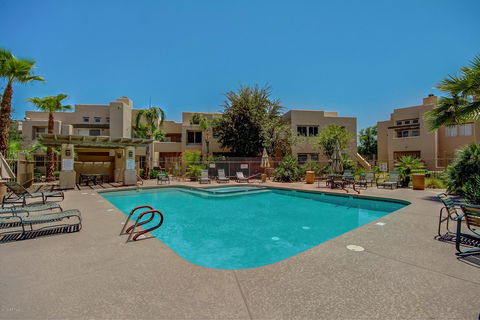 MOUNTAIN VIEWS and Tennis court views right from your great room and balcony! This light and bright unit with soaring ceilings features 2 bedrooms both with walk-in closets/ 2 baths and a natural burning fireplace in the great room. It has been meticulously maintained and is spotless! The community features 2 heated swimming pools, spa, workout room and professional grade tennis courts sure to please any tennis enthusiast. Location, location, LOCATION! Close to walking trails, health care facilities, shopping and Scottsdale's favorite restaurants. This is the LARGER more desirable unit at 1294 square feet and is sure to go fast. IT IS THE LOWEST PRICE/SUARE FOOT CONDO CURRENTLY ACTIVE IN 85260 - Don't miss it!