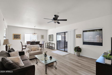 Welcome to this charming first-floor gem in the Villages North condo complex, perfectly situated across from the community pool and mailboxes! This unit offers the convenience of single-level living with no interior steps, making it easily accessible and comfortable. Inside, enjoy the abundance of natural light that fills the spacious living area with beautiful flooring flowing throughout. The elegant kitchen features attractive mahogany shaker-style cabinets and a breakfast bar, ideal for extra seating and enhancing the open-concept layout. The split-bedroom layout provides privacy, with the guest room at the front and the primary suite in the back, separated by a powder room. The primary suite offers a relaxing retreat, complete with a luxurious walk-in shower in the en-suite bathroom.