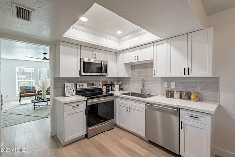 Absolutely stunning updated home in hot South Scottsdale! No stone unturned in this one; New kitchen cabinets and quartz counters, new laminate flooring and carpet, new windows, new stainless appliances including Samsung counter depth fridge, new tub and shower surrounds in both bathrooms, new interior paint, new plumbing and lighting fixtures, new lighted mirrors in both bathrooms, gorgeous travertine patio flooring, washer/dryer included, the list goes on! The home backs to Eldorado Park. All of this within minutes of Old Town, Fashion Square Mall, SkySong and the 101 Fwy. This is a wonderful home! Listing agent is also the owner.