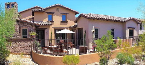 Tuscan Villa in DC Ranch - best lot in community! Poolside location with maple cabinets, oak hardwood floors, wood shutters & blinds, epoxy garage floors, and ceiling fans throughout. Desirable floorplan features French doors in master, kitchen, and great room that all open to a HUGE 1,200 sq. ft. courtyard bordering a spectacular natural wash. Kitchen has vaulted ceilings, stainless steel appliances, gas cooktop, and granite slab countertops. Gated community is within easy access of 101 freeway, and offers exclusive DC Ranch amenities, hiking trails, fitness center, and nearby shopping & dining.