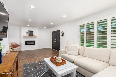 Paradise in Scottsdale FOUND! This charming 3 bed, 2.5 bath townhome, is minutes from the Old Town Scottsdale Entertainment District, Sky Harbor Airport, Camelback Mountain and MORE! Your new home is complete with newly renovated wood plank tile throughout the downstairs, updated and on trend light fixtures and fresh neutral paint throughout. Enjoy custom elements like the built in electric fireplace downstairs and vanity space in the primary suite upstairs. Entertain guests in this spotless kitchen boasting quartz countertops with waterfall effect and white shaker cabinets, or the cozy back patio with pavers and artificial turf...take your pick! Home includes 2 covered parking spots w/ storage unit. Community offers grass areas, clubhouse, & large pool for year-round enjoyment!