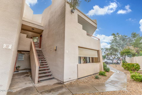 The kitchen was completely redone with sleek quartz countertops, stainless steel appliances, and updated finishes that make the space both stylish and functional. The bathroom vanity and faucets were replaced, and the home features updated flooring throughout, along with a newer washer and dryer. Located on the second floor as a desirable end unit, this home offers extra privacy and an additional bedroom window that allows for even more natural light. The west-facing balcony is the perfect spot to unwind and enjoy Arizona's beautiful sunset views. You'll love the location -- within walking distance to shopping and restaurants, and with quick access to the 51 and 101 for an easy commute.