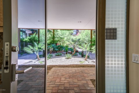 Welcome to this phenomenal rare Optima Camelview private entrance casita. Offered at an incredible price this must see condominium boasts a large backyard terrace with breathtaking mature trees and landscaping. **Monthly landscape maintenance is included in your HOA payment for this unit.** This unit features travertine flooring, granite countertops, stainless steel appliances and floor to ceiling glass windows with beautiful views throughout all living and bedrooms. All found within the luxurious Optima Camelview Village with it's unbeatable location and more amenities than you can imagine.
