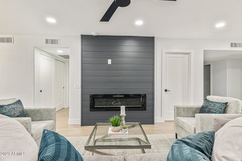 MAKE THIS GEM YOURS BEFORE IT'S GONE! This luxurious patio home has been extensively renovated and waiting just for you! 2 Bedroom plus Office/3rd Bedroom. Enjoy relaxing afternoons in your back gated patio listening to a soothing waterfall. Highly upgraded modern interior with smart Modern Form Fans in the living room, 60-inch elongated modern fireplace, LVP wood-look waterproof floors, plantation shutters, and Minka-Aire fans in bedrooms. Spotless kitchen has new Delta Champaign Bronze faucet, 3/4 HP Moen garbage disposal installed on Ruvati workstation sink, quartz countertops, LG SS appliances and soft close shaker cabinets. Seller has invested approx $21k in new plumbing, both above and UNDERGROUND! Remodel work approved by City of Scottsdale! Beautifully remodeled and move-in ready!