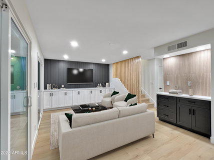 Just a short walk from Old Town Scottsdale, this newly remodeled townhouse boasts 2 bedrooms, 1.5 bathrooms, 2 carport spaces, and 1,114 sqft of beautiful living space. Upon entering, you'll be greeted by fresh paint, luxury vinyl plank flooring, tall white trim, and numerous accent features. Just off the entryway, you'll find the half bathroom adorned with black vertical ship lap, a new vanity, and quartz counters. The main living space offers ample storage with white base cabinets beneath the TV wall and a coffee bar featuring counter-to-ceiling wood-look tile. Adjacent to the main living space is the galley kitchen, equipped with all-new cabinetry, stainless steel appliances, and quartz counters. On the upper floor you'll discover two bedrooms, including the primary suite. These two bedrooms share a full bathroom with two-tone tiling and bright LED lighting. The primary suite features a spacious walk-in closet and an elegant black accent wall. The second bedroom offers plenty of space for a king-size bed or can be used as your own office. Don't overlook the private back patio with new landscaping, including turf and string lights. Additionally, there's a laundry room off the patio, complete with a washer and dryer. A few more noteworthy upgrades include the new windows and slider doors, as well as the new HVAC system installed within the last 2 years!