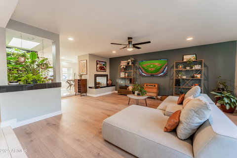 Discover the perfect blend of comfort and style in this beautifully updated 3-bedroom, 2-bathroom patio home nestled in the highly sought-after Villa San Marcos community—just a half-mile from the vibrant heart of Old Town Scottsdale! This 1,876 sq. ft. home boasts a bright and open floor plan, featuring expansive windows that fill each room with natural light. The spacious living area is centered around a stunning two-way fireplace, creating a cozy ambiance that seamlessly connects the kitchen and family rooms.