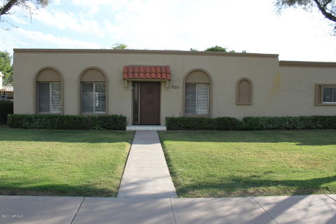 Charming Townhouse offers windows across entire back that lead to large brick paved covered patio with citrus trees. Home boasts lots of natural light, new carpet, paint and wood shutters on all front windows. Very clean and ready for move in. Both bedrooms have walk-in closets and master has sliding glass door to back patio. Master bath remodeled, interior and exterior painted and roof recoated this year. 2 car covered parking right out your back door. Located in the heart of Scottsdale with dining, and night life minutes away, yet still the luxury of a quiet community.