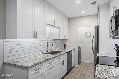 Welcome to Casita Real, a charming South Scottsdale community! This beautifully updated 1-bedroom plus den condo offers style, flexibility, and an unbeatable location just minutes from some of Arizona's best shopping, dining, and entertainment. Updated in 2019, it features wood-look tile floors, granite countertops and white cabinets in the kitchen, and an in-unit washer and dryer. This private interior unit is conveniently located near the community pool, surrounded by mature landscaping and plenty of green space. Enjoy community amenities including a pool, spa, grills, doggy stations, and a gated dog exercise area. Assigned covered parking and plenty of visitor parking add to the convenience. Perfect as a primary home, lock-and-leave getaway, or short-term rental with proven STR income.