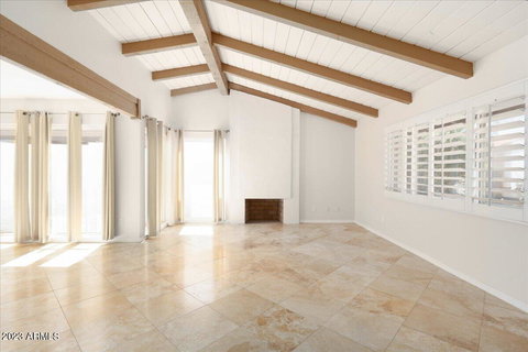 Nestled in a quiet McCormick Ranch neighborhood with tree-lined streets and a community pool, home has been tastefully remodeled with travertine floors, dual-pane windows and doors, and fresh paint. The wood-burning fireplace, vaulted tongue & grove ceiling w/ beams and wooden shutters create a cozy ambiance, while new carpeting in the bedrooms adds a touch of comfort. The kitchen boasts updated cabinetry, granite countertops, and newer stainless-steel appliances. Bathrooms have been updated and primary suite has a large walk-in closet. The spacious outdoor patio, perfect for soaking up the Arizona sunshine. This home is conveniently located near popular neighborhood restaurants at The Grove and is just a short bike ride away to many parks, golf courses, and Downtown Scottsdale. Additionally, this home features an attached 2-car garage with newer insulated garage door, for added convenience. Don't miss this little gem in McCormick Ranch! HOA is in the process of updating the landscaping.