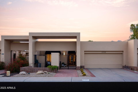 Exceptional contemporary home located in the Sands McCormick community. This remarkable property boasts teakwood floors accompanied by freshly honed travertine, new countertops, Wolf oven and a Subzero fridge. Oversized bedrooms with newer carpet and a split floor plan. The home opens onto the patio with remarkable views of the greenbelt not to mention the sound of your own waterfall. The home has a newer AC and a freshly recoated roof along with a 5 year guarantee. The future homeowner will enjoy private access to the Camelback greenbelt walking path with nearby restaurants and shopping. The community pool/spa and pickleball court is conveniently located. Also included with your HOA is RV parking in the locked RV yard.