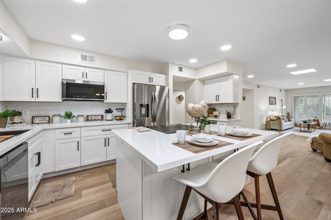 WELCOME TO YOUR NEW HOME NESTLED IN SCOTTSDALE. THE ENTIRE HOME HAS BEEN REMODELED WITH A LARGE KITCHEN WITH SKYLIGHTS, ALL NEW CABINETS WITH QUARTZ ISLAND. UPGRADED HIGH END APPLIANCES INCLUDING INDUCTION OVEN WITH SELF CLOSING DOOR, DUAL ZONE WINE FRIDGE, AND FRENCH DOOR FRIDGE WITH DUAL ICE MAKER. INDOOR LAUNDRY WITH WASHER AND DRYER INCLUDED. SHUTTERS THROUGHOUT HOME, NEW 2 TONE PAINT & FLOORING, LIGHTING & PLUMBING FIXTURES. 2 VERY LARGE BEDROOMS. WALK IN MASTER CLOSET. HALL BATH WITH NEW TILE & VANITY, AMAZING MASTER SHOWER NEW MARBLE TILE , DUAL SHOWER HEADS AND A RELAXING SOAKER TUB. LARGE PATIO AND FRONT COURTYARD. H20 SOFTENER, NEWER AC/ROOF. A BEAUTIFUL FIREPLACE, COMMUNITY POOL AND TENNIS COURTS.