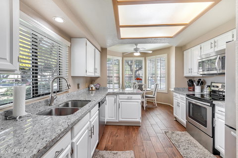 Neighborhood Gem in Scottsdale Ranch is light & bright with vaulted ceilings and skylights and sits on a corner lot that sides to grassy area. Updated spacious kitchen with eat-in area, granite countertops, stainless steel appliances and pantry closet. Other features include shutters and wood blinds, wood like tile throughout and remodeled bathrooms. Enjoy desert living at its finest on your own private patio with a wood burning fireplace. This wonderful property is only a short distance to the community heated pool and spa. Close to senior center, Laguna Elementary, Scottsdale Ranch Park, tennis, golf, restaurants, shopping and more.