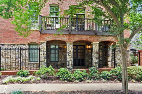 "Honey, stop the car! This is IT!" Rare offering. Stunning light-filled 3 story end townhouse blocks from restaurants, shops, new Braves Stadium. High ceilings, crystal chandelier, plantation shutters, new carpet, beautiful wood floors. Entertain in the open layout with huge island in the kitchen/DR. Tall shelving and fireplace in the LR. French doors to leafy private patio and the balcony in the trees. Master with huge ensuite and walk-in closet with custom built-ins. Quiet, friendly neighborhood.